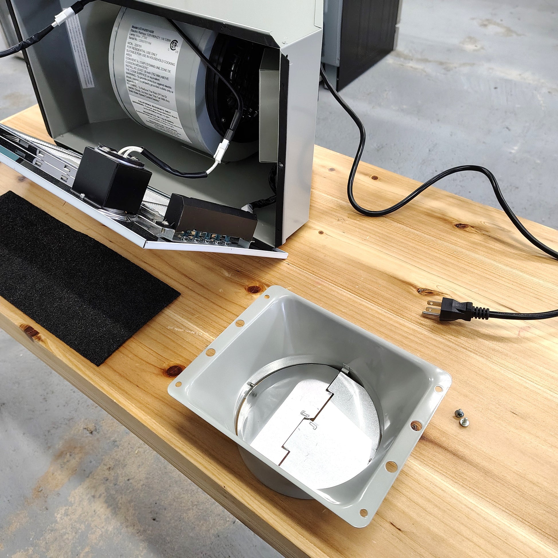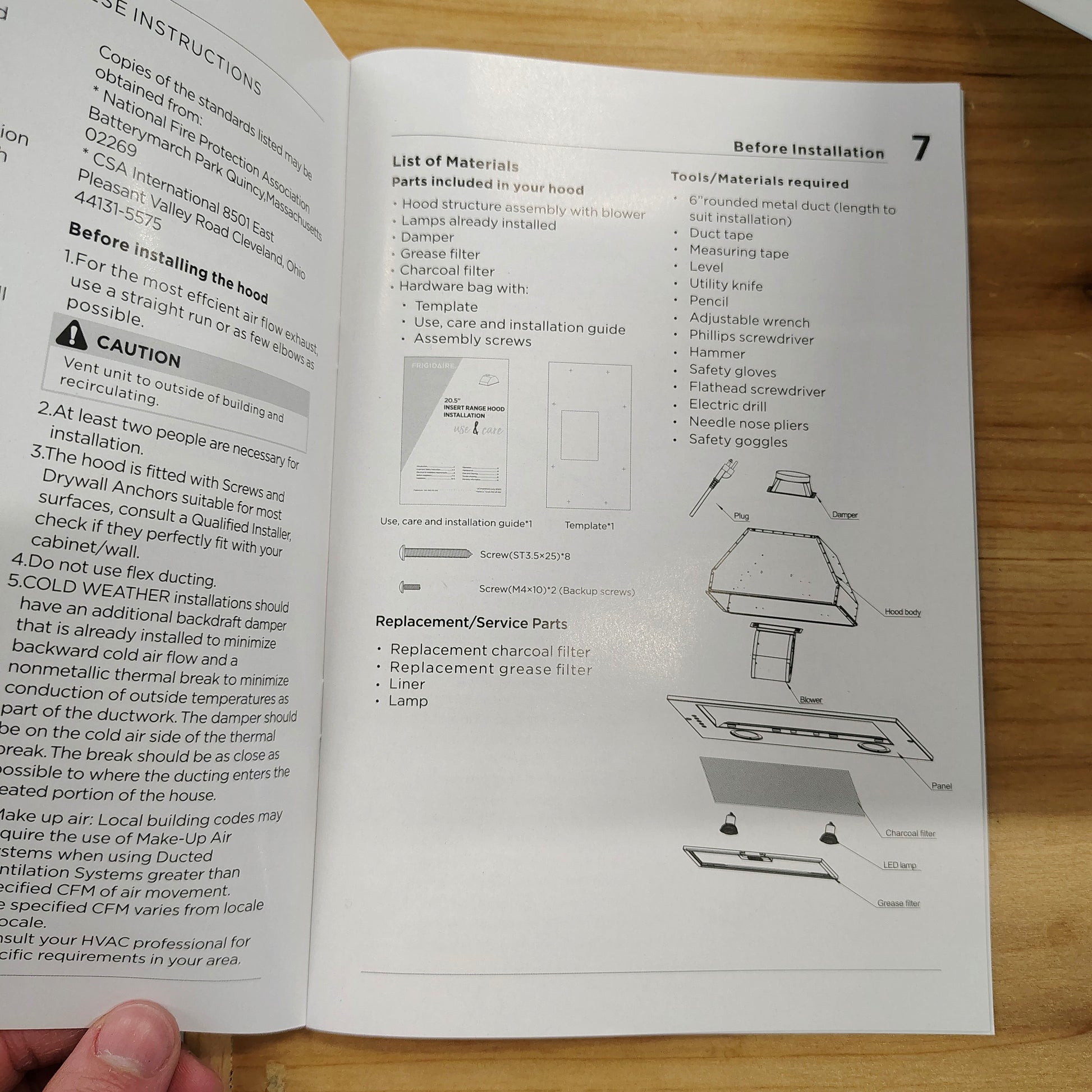 This RoHS-compliant range hood has a 3-speed, 313 CFM blower and two LED lights. Its grease filter is dishwasher safe. This unit is new-in-box and has all of its pieces. It's stainless steel, but it has a white protective covering on the front.