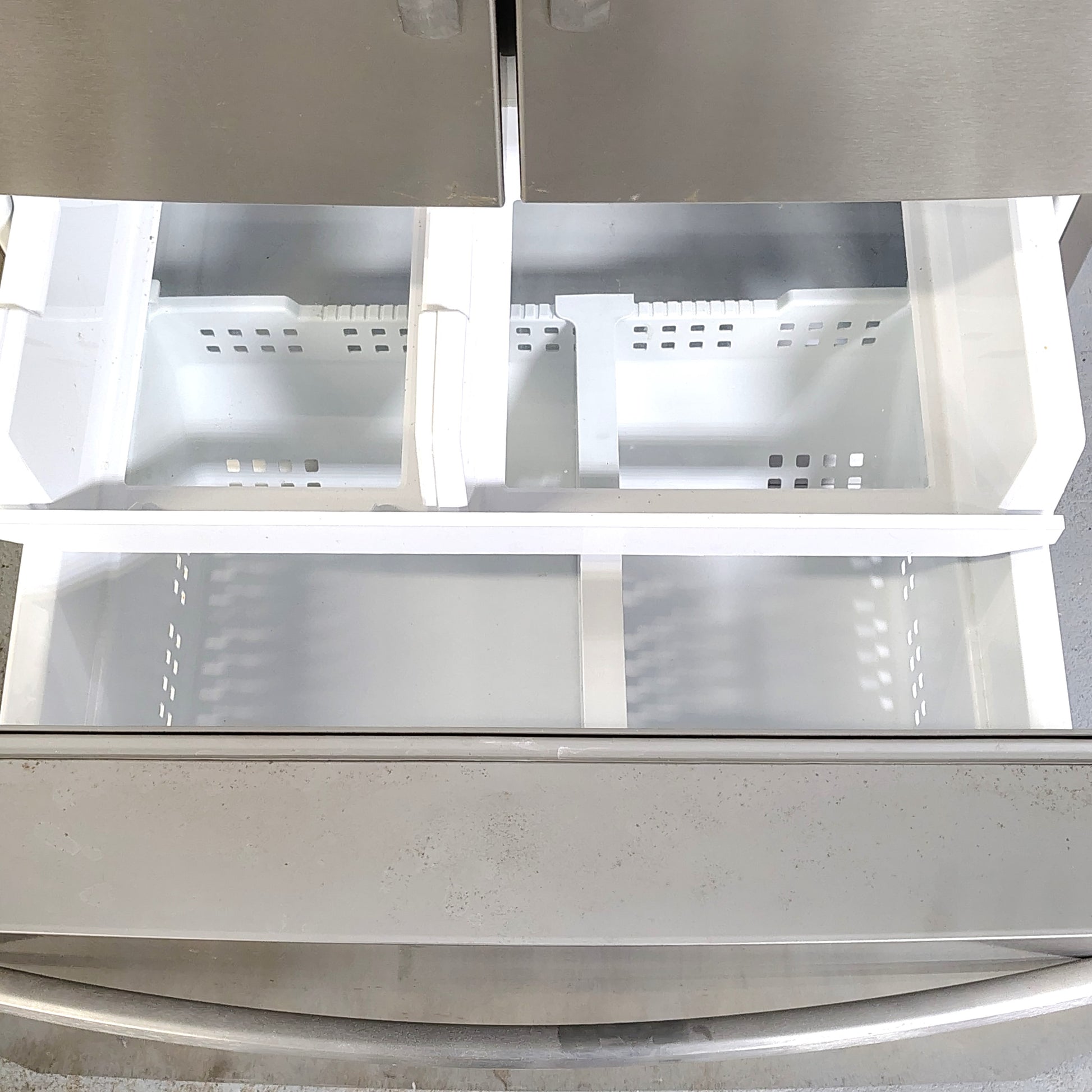 This Frigidaire French door refrigerator helps keep fruits and vegetables fresh longer with CrispSeal® crispers which blocks dry air from entering your crisper to avoid premature shriveling. Easily stay organized with a full width deli drawer and large door bin storage. Keep safe, great tasting water flowing. The filter reduces up to 99% of contaminants. It is in great condition.