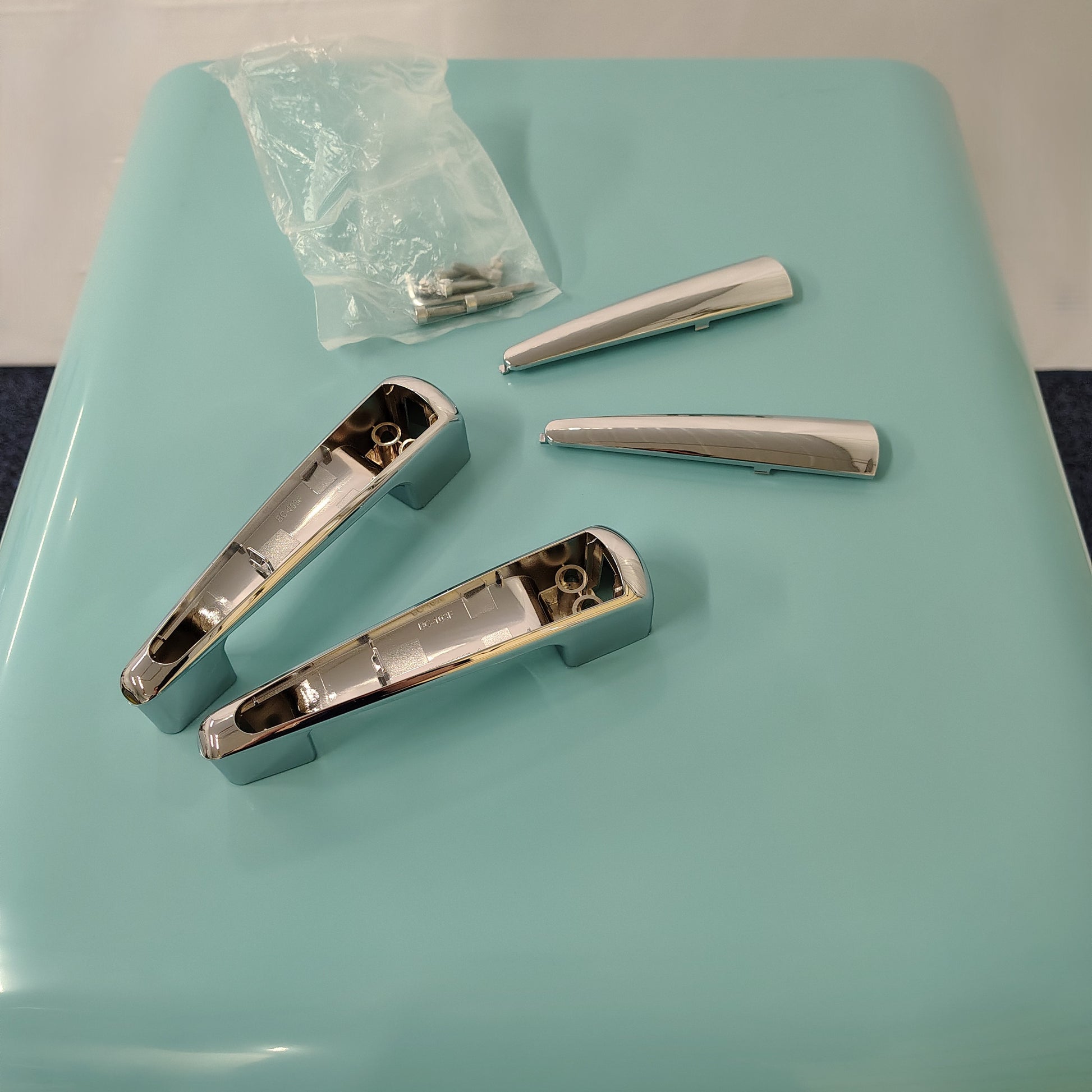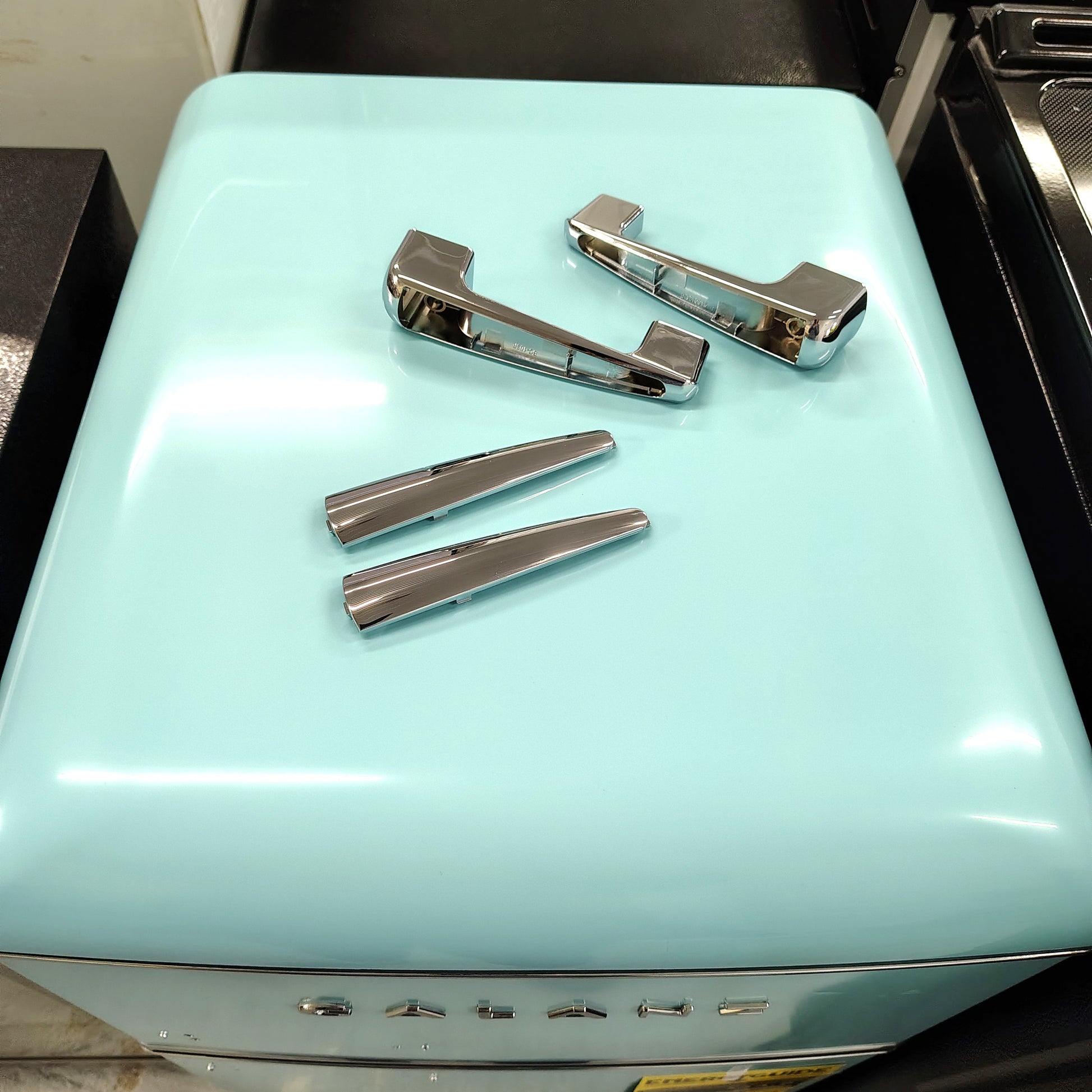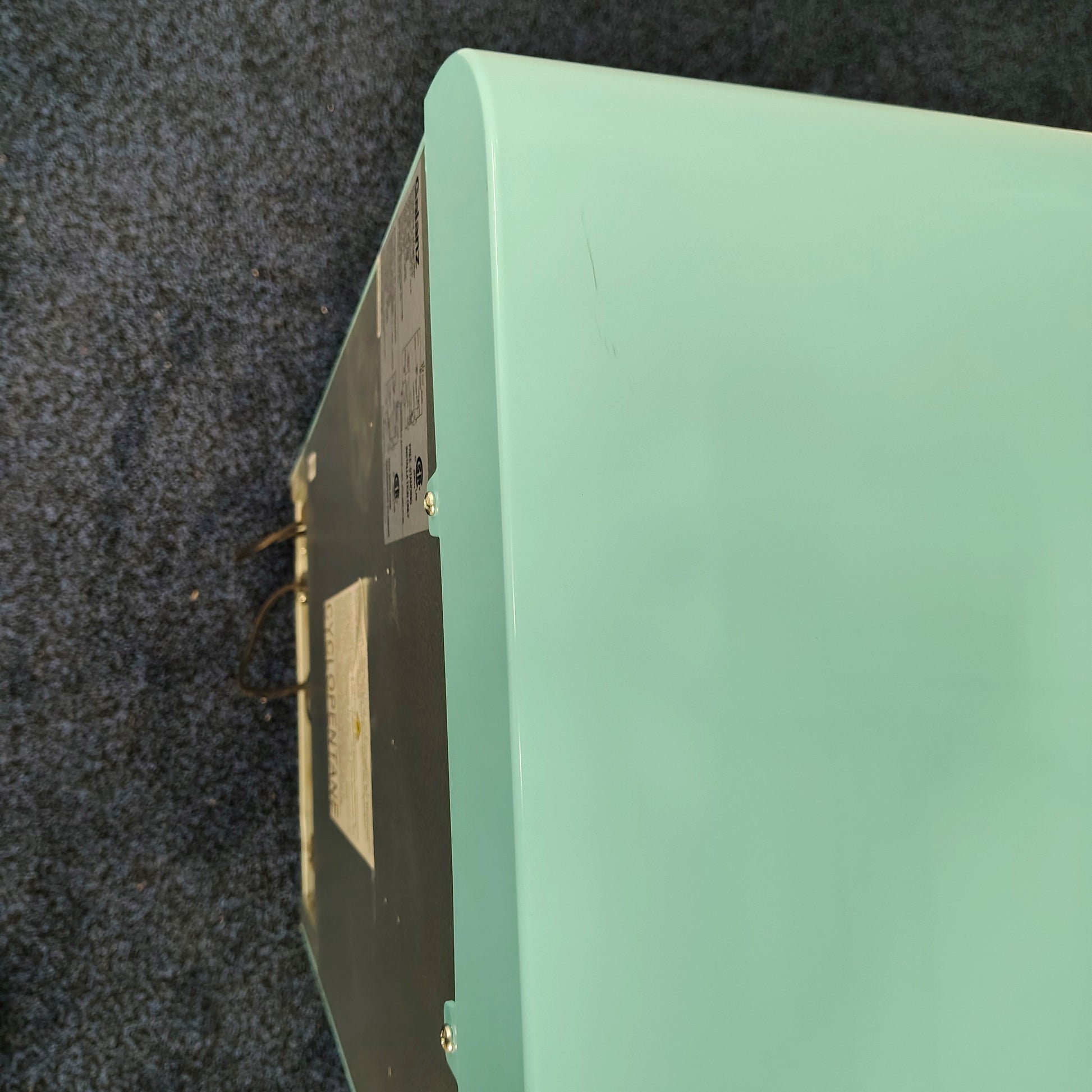 This eye-catching 60's-inspired mini fridge works perfectly and has separate fridge and freezer sections. The vintage-style handles are included as well as the owner's manual. It has one scratch across the front and a smaller one at the back top corner.