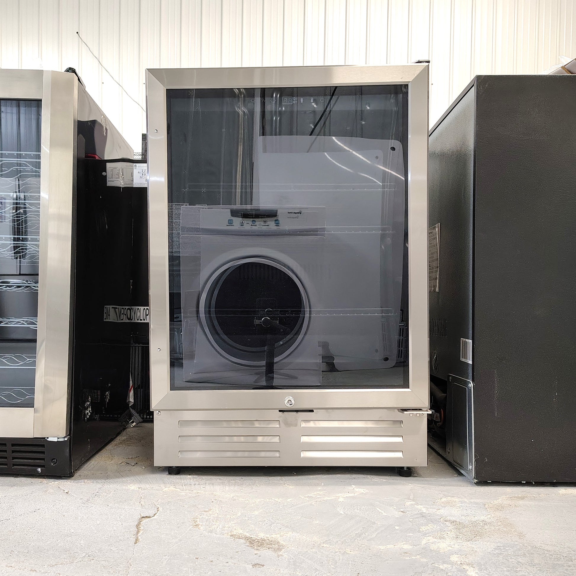 Stock up on beverages with this glass-door, stainless-steel beverage cooler that can hold up to 210 12-oz cans. It has durable wire shelves and comes with keys to keep the kids from getting in. It's handle, hardware, and owner's manual are included. The front vent design allows for built-in or freestanding use.