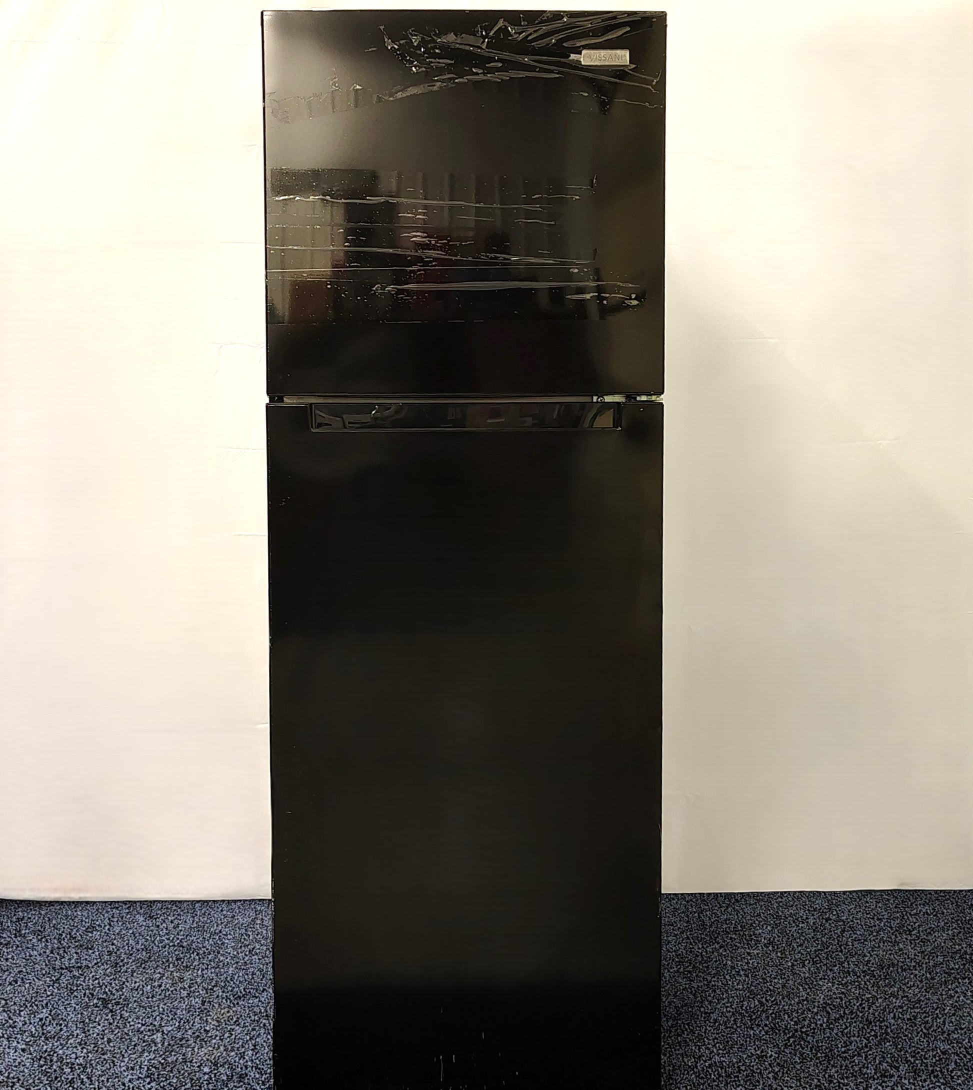 This Black Vissani top freezer refrigerator works perfectly, has 5 temperature levels, and maximizes usable space with full-width glass shelves and drawer as well as door shelves. It has some dents on the exterior back corners and tape across the front, which brings the price down from Home Depot's listing of $379 to $330.