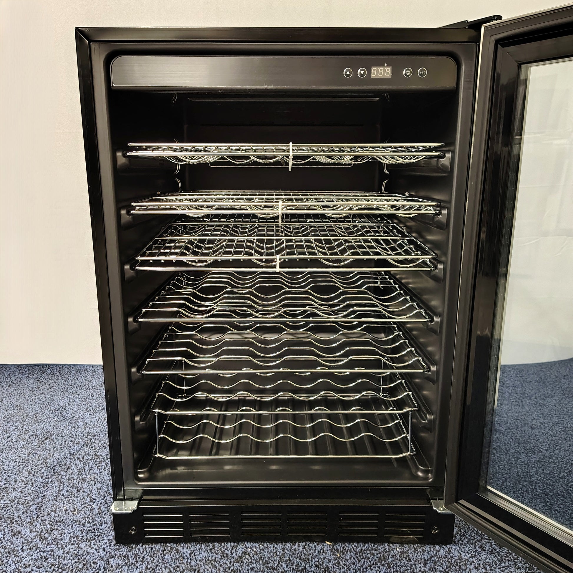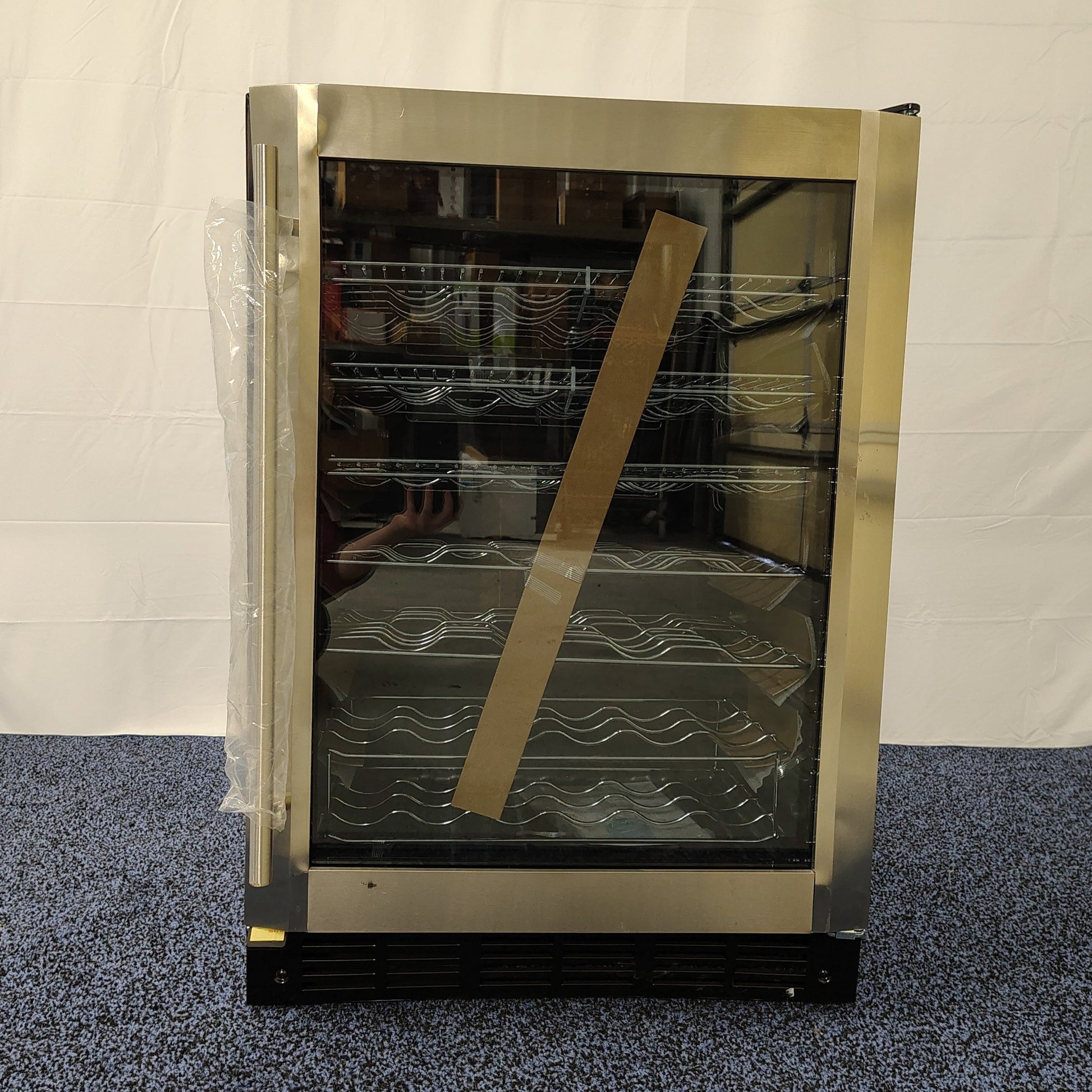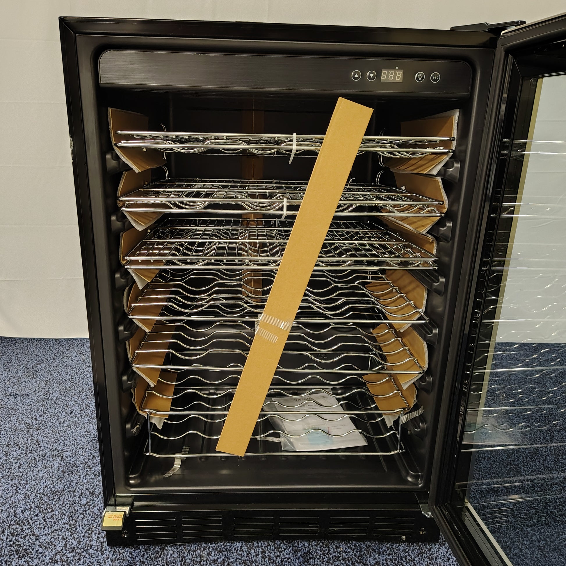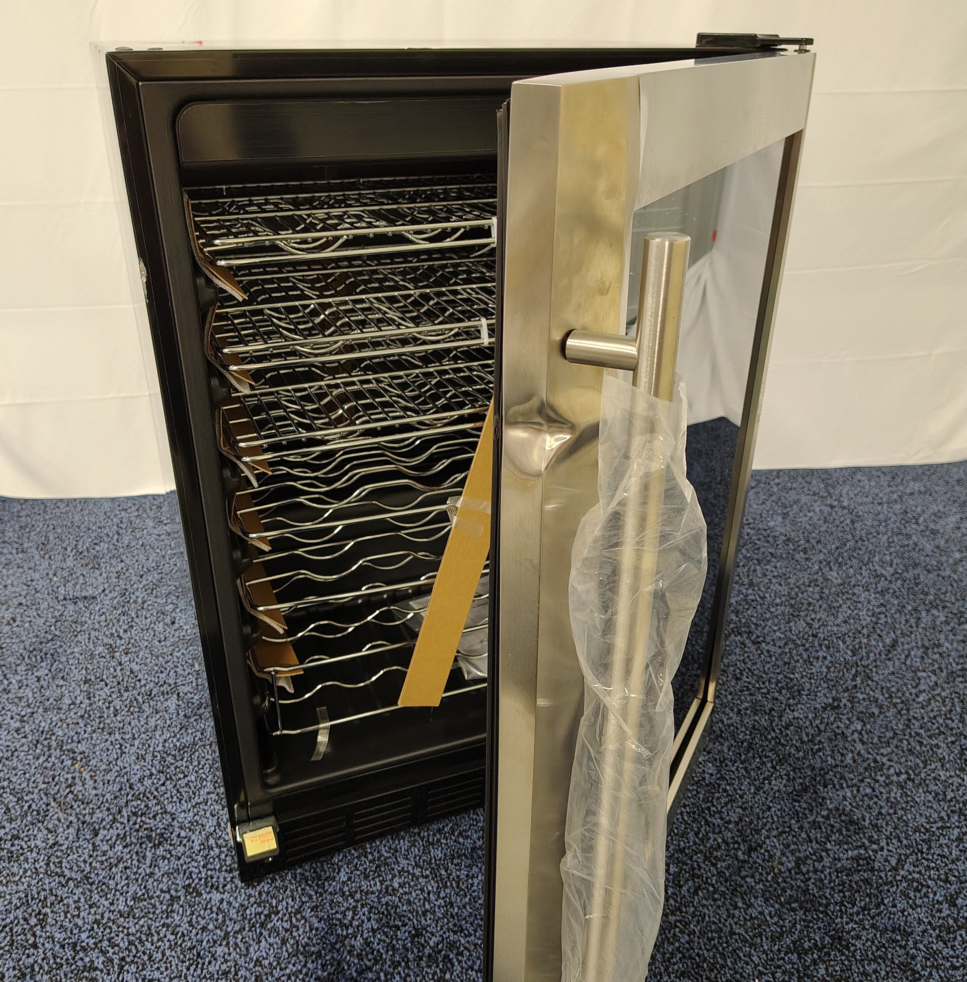 The cooler's elegant, sturdy chrome shelves can hold up to 154 (12 oz.) beverage cans or up to 50 wine bottles. The stainless-steel frame and handle offer durability and an attractive look, and the smoked glass door is reversible for functionality in any space.